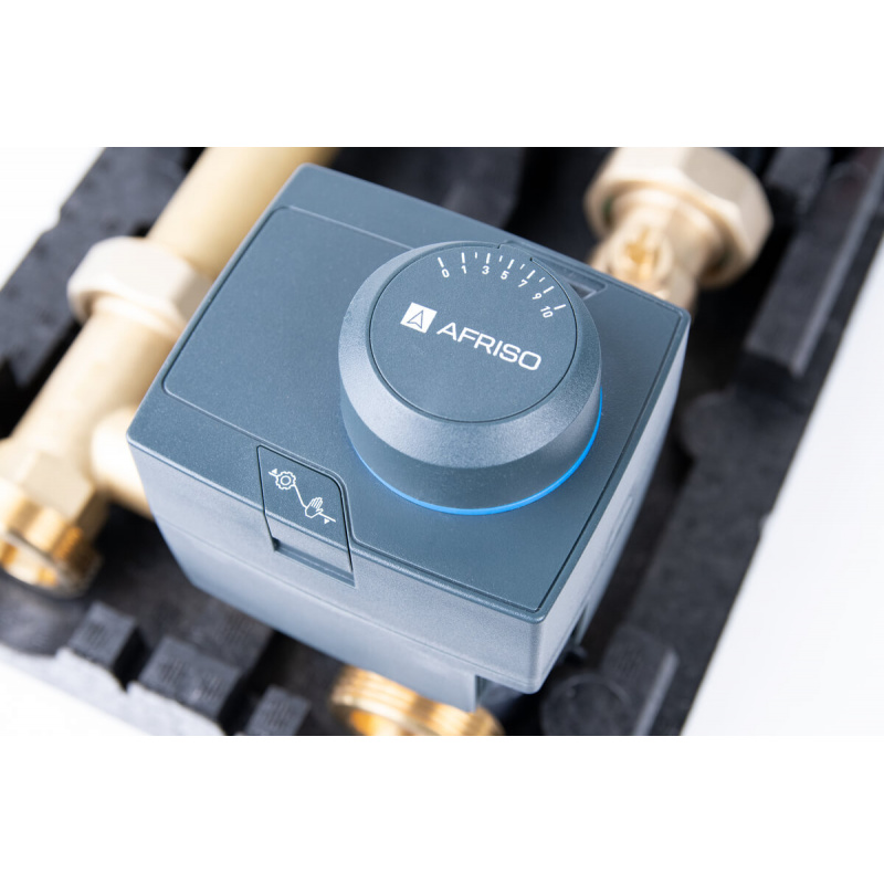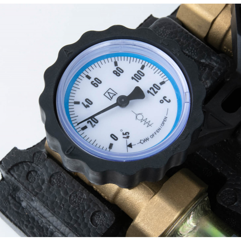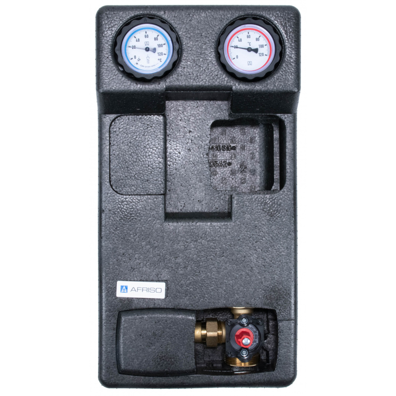 | Комплектація | Кульовий кран з гравітаційним гальмом, термометр (синій), кульовий кран, термометр (червоний), кульовий кран на лінії прямого потоку, 3-ходовий змішувач, електропривод змішувача, ізоляція, настінне кріплення і комплект для підключення. |
