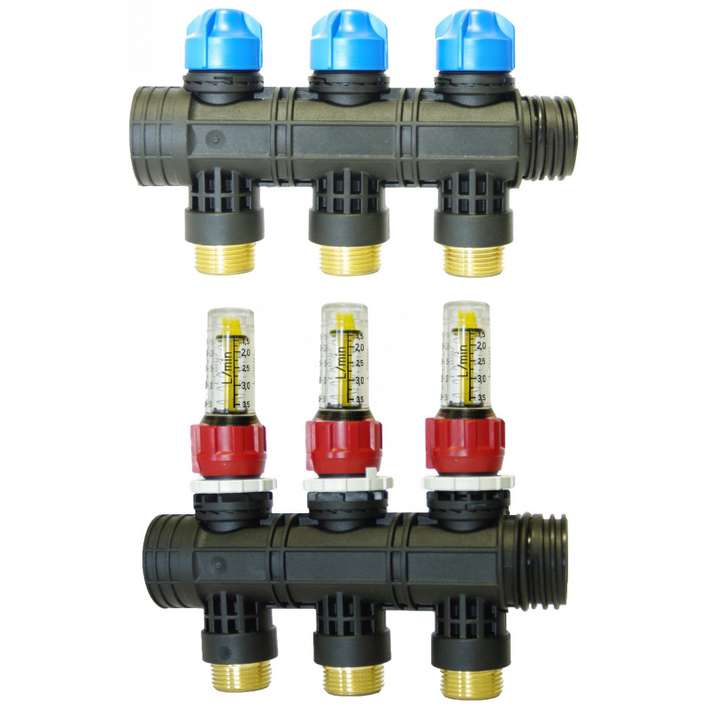 | Комплектація | 2 колектора (подаючий і зворотний) Витратоміри з регулюючими клапанами Термостатичні клапани (без приводу) 2 клапана наповнення / зливу |