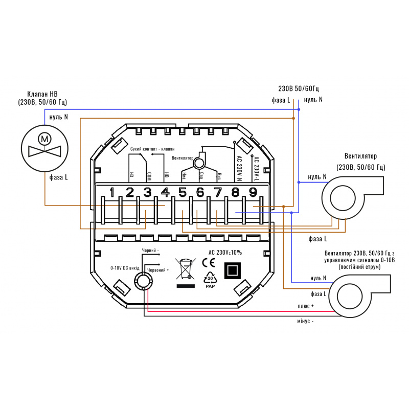 | Вихід | «сухий» контакт (без напруги) NO+NC+COM - клапан, 230В AC - вентилятор, 0-10В DC - вентилятор (0 - стоп, 3В(2-4) - перша швидкість, 5В(4-6) - друга, 9В (8-10) - третя) |