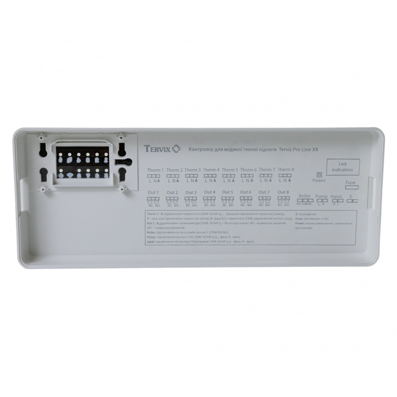 511208 Провідний контролер для водяної теплої підлоги Tervix Pro Line Х8 (8 зон) Контролер X8 призначений для управління системою водяного підлогового опалення на 8 зон, циркуляційним насосом та котлом.