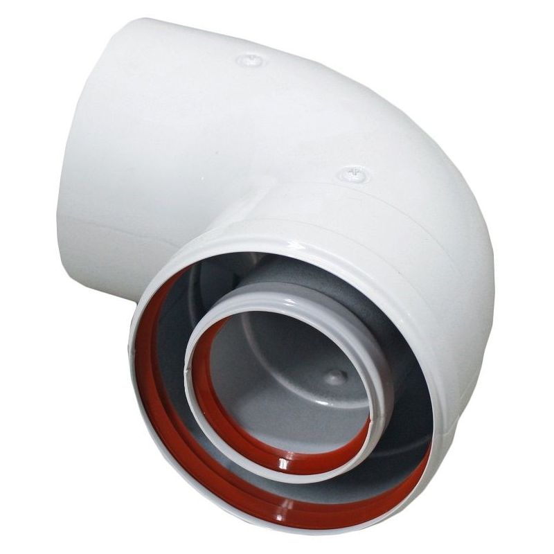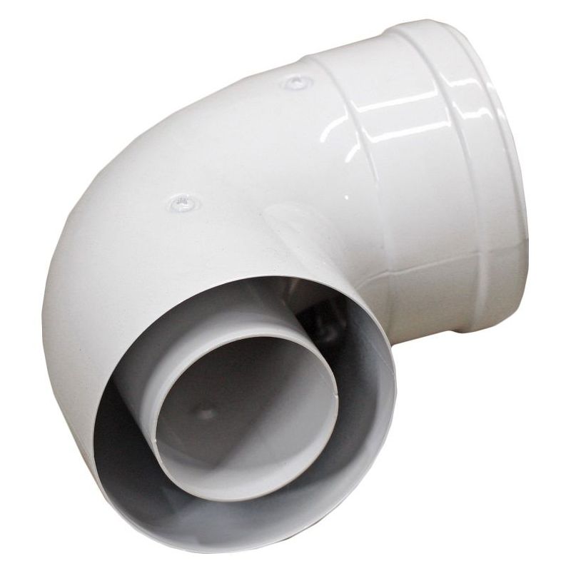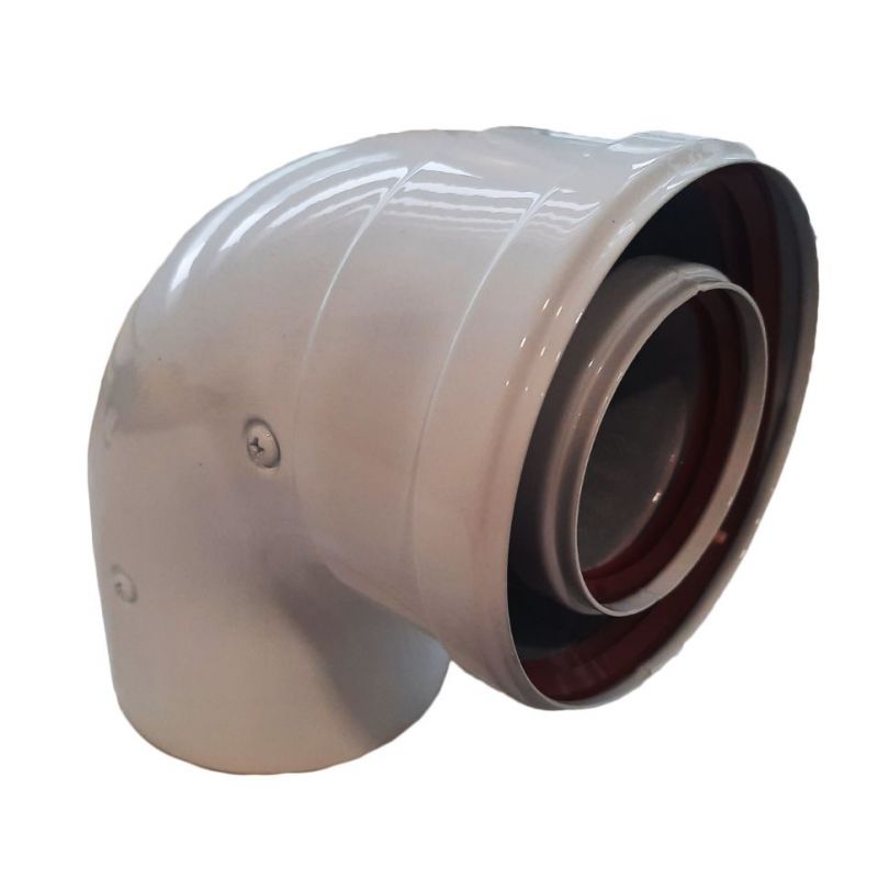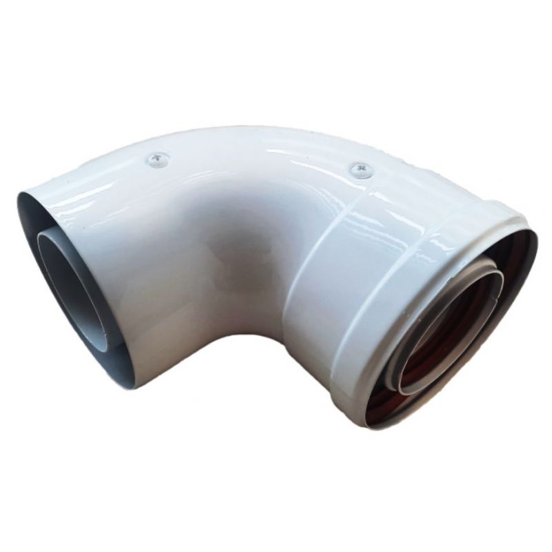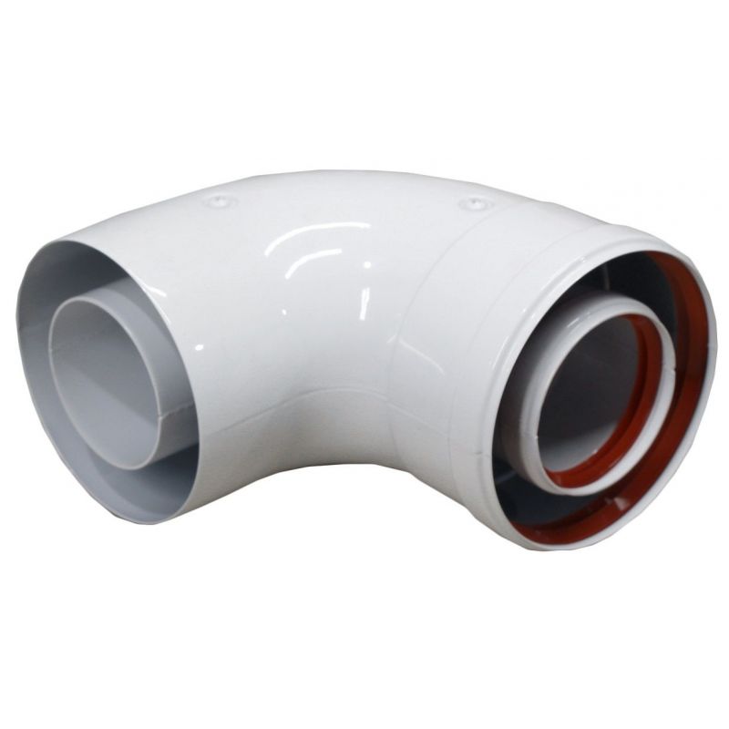 Коліно для котла 90 град. МАМА-ПАПА коаксіальний d60/100 AL + FE. Дана продукція сертифікована і має сертифікат CE (Conformit? Europ? Enne - «європейське відповідність»). Матеріал виготовлення зовнішня частина - алюміній, внутрішня частина - залізо, так само є прокладки для герметичності з'єднання.