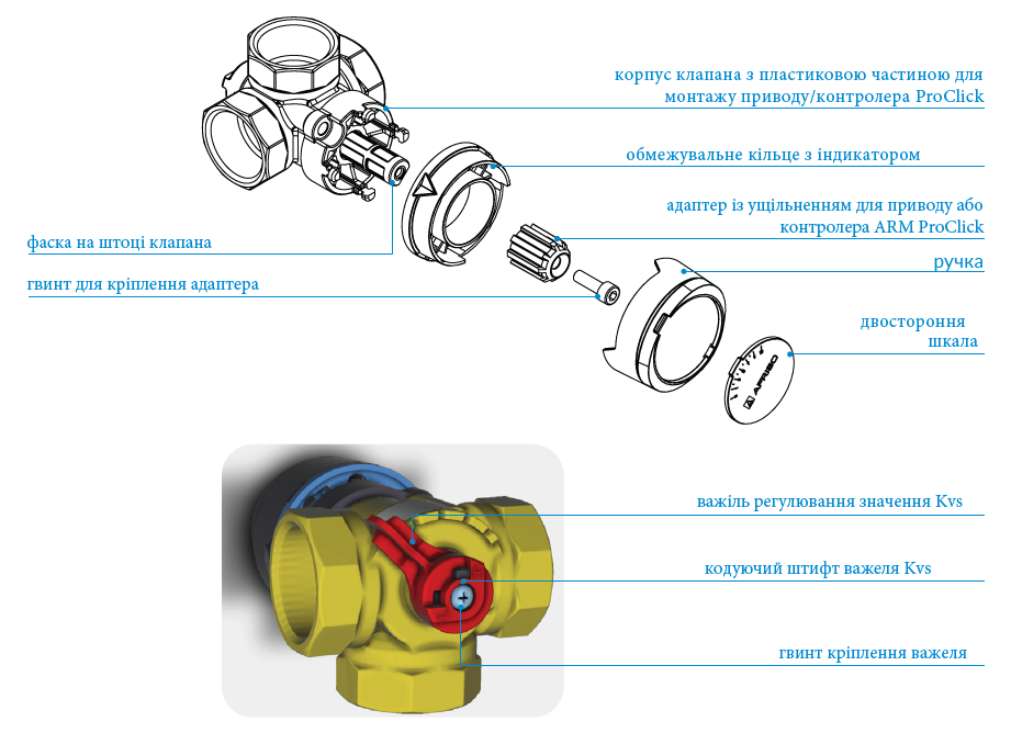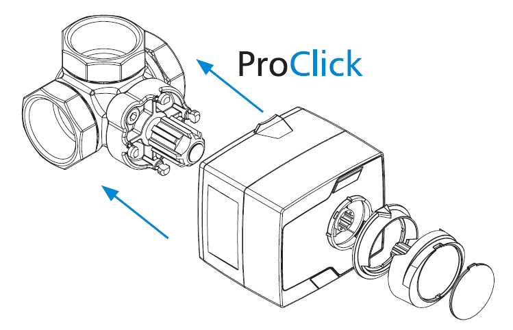 Під ручкою клапана ARV Vario ProClick є адаптер для монтажу електроприводу або контролера ProClick. Використання системи кріплення ProClick дозволяє просто зняти з клапана ручку і синє обмежувальне кільце, а потім встановити привід або контролер ProClick у потрібне положення, так щоб механізм кріплення зафіксувався на клапані. При використанні клапана в режимі змішування необхідно використовувати контролер ACT/ARC ProClick або 3х-точковий привід (наприклад, AFRISO ARM 343 ProClick).