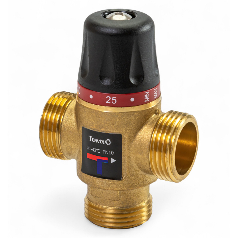 Термостатичні змішувальні клапани Tervix Pro Line TMV призначені для регулювання температури шляхом змішування двох потоків води таким чином, що на виході вода має постійну задану температуру. Внутрішній термоелемент використовується для автоматичного регулювання співвідношення подачі гарячої та холодної води. Клапани широко використовуються в побутових системах гарячого водопостачання та системах теплої підлоги і опалення. Завдяки контролю температури в режимі реального часу, клапани забезпечують комфорт і безпеку та запобігають ошпарюванню користувачів або пошкодженню труб теплої підлоги та покриття підлоги через високі температури води.