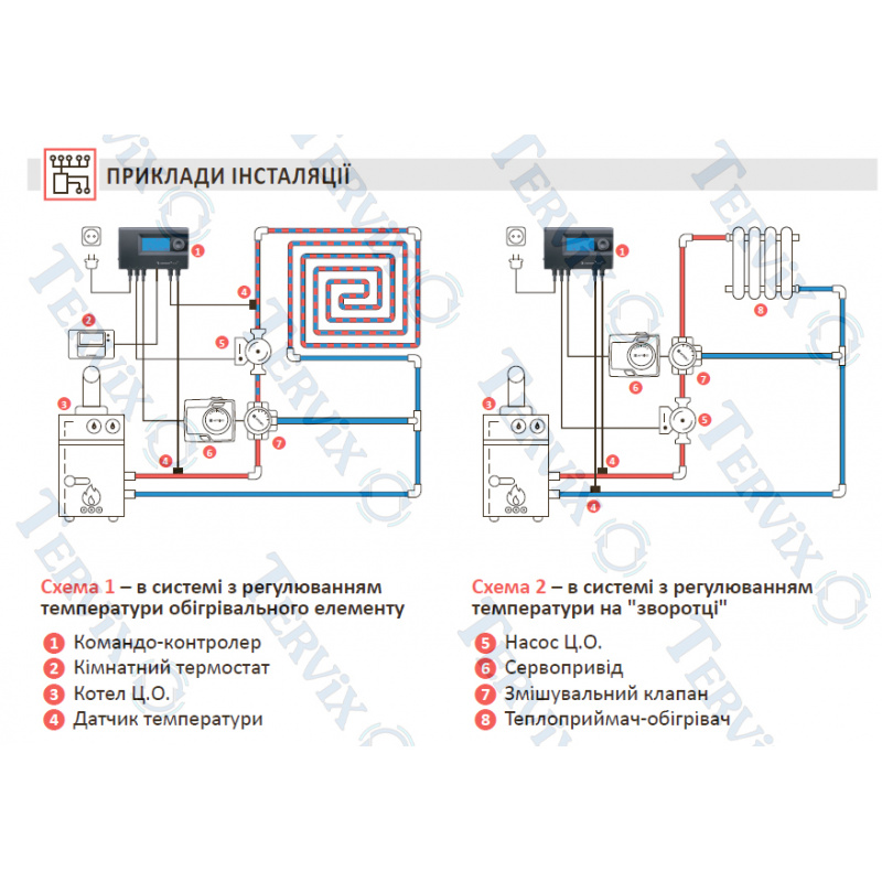 | Комплектация | контролер, датчик температури обігрівального контуру, датчик температури котла, мережевий кабель, кабель живлення для насоса, кабель живлення для привода кла- пана, шаблон для кріплення, затискаючі стяжки датчиків, розпірні дюбелі, посібник з експлуатації, • контролер; • датчик температури обігрівального контуру; • датчик температури котла; • мережевий кабель; • кабель живлення для насоса; • кабель живлення для привода кла- пана; • шаблон для кріплення; • затискаючі стяжки датчиків; • розпірні дюбелі; • пос |