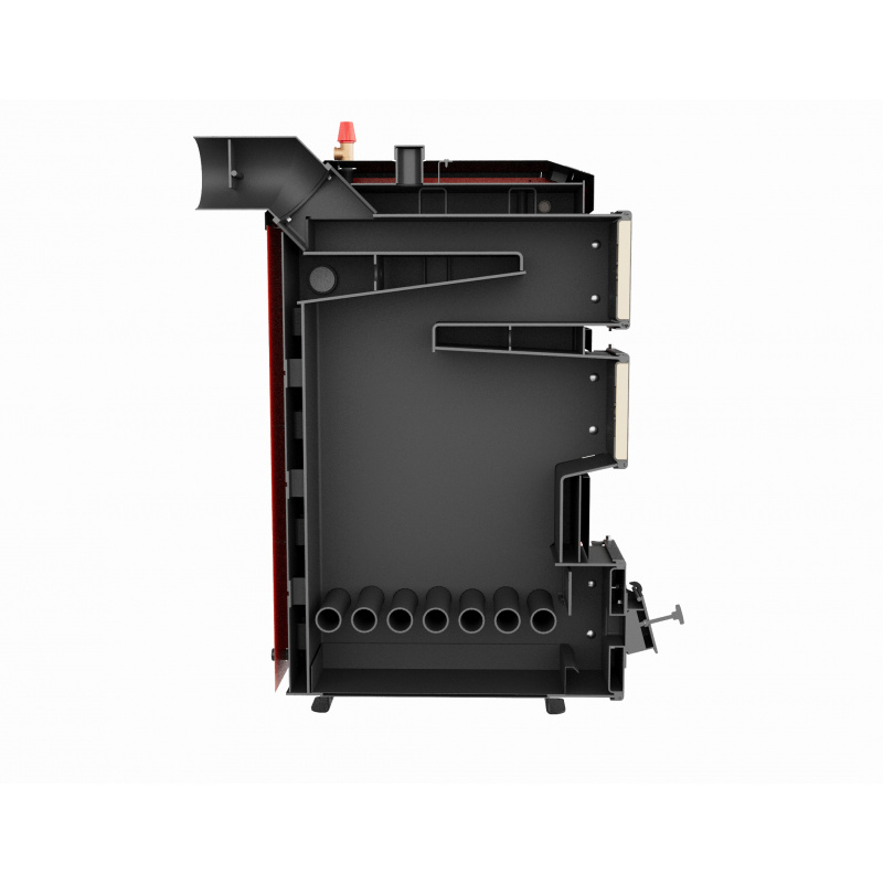 Водоохолоджувальні колосники з цільностягнутої труби та 2-х ходовий пенальний теплообмінник, а в котлах від 40 кВт 3-х ходовий - дозволяє максимально збільшити корисну площу зняття тепла, а також зручно чиститься через верхні ревізійні дверцята. Найбільша камера згоряння (топка) на ринку України в цьому класі