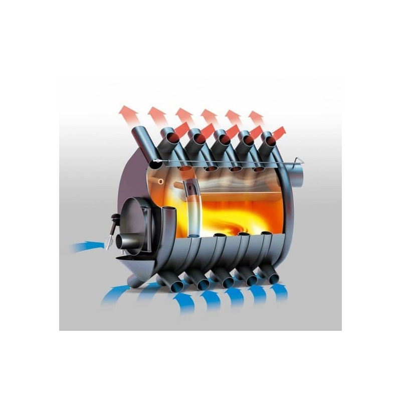 - Булер'ян працює за конвекційною технологією, а це забезпечує швидке нагрівання повітря і його розподіл завдяки трубам, що оперізують топку.