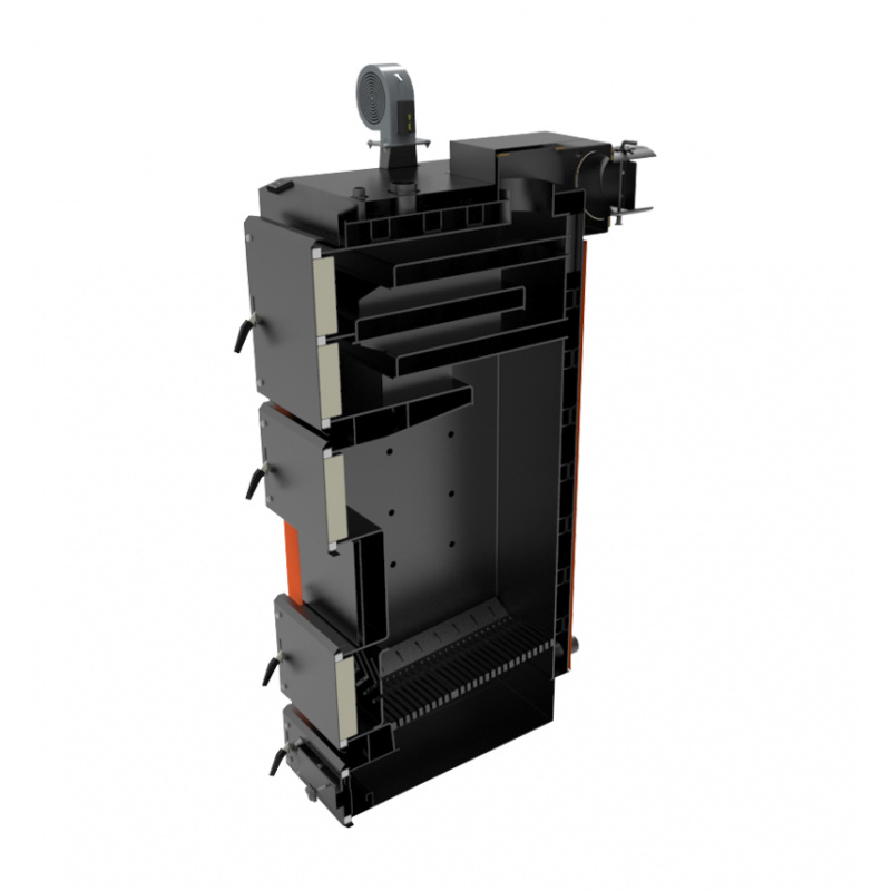 Чотириходовий теплообмінник пенального типу дозволяє максимально збільшити корисну площу зняття тепла, а також зручно чиститься через верхні ревізійні дверцята.