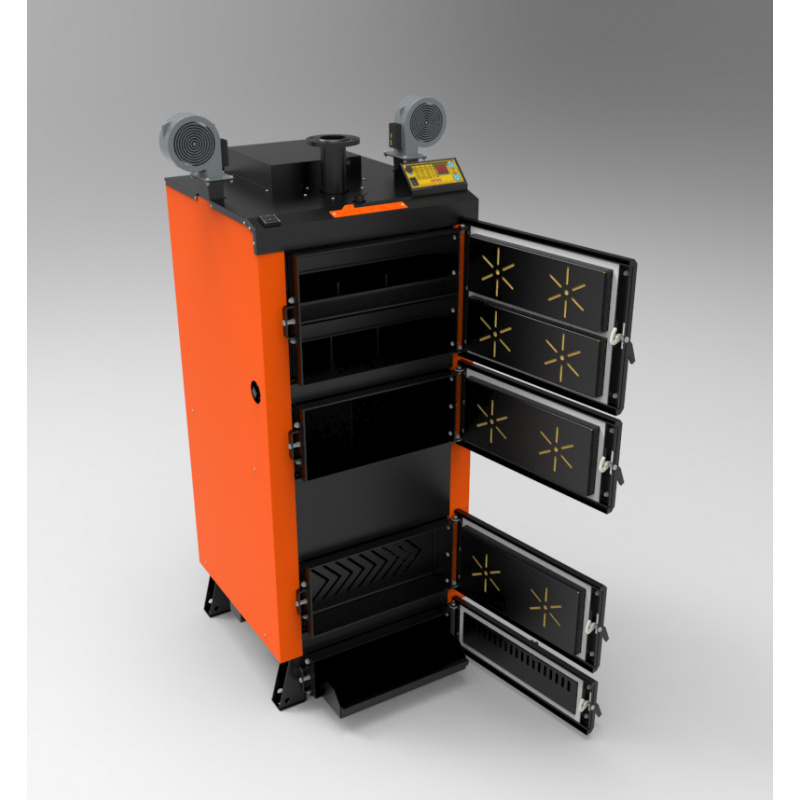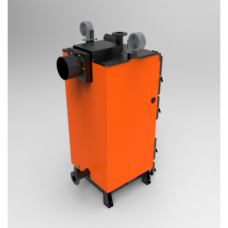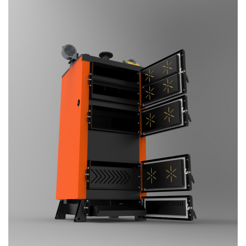 Чотириходовий теплообмінник пенального типу дозволяє максимально збільшити корисну площу зняття тепла, а також зручно чиститься через верхні ревізійні дверцята.