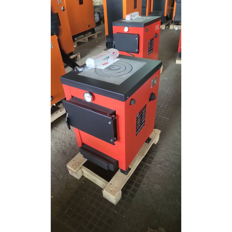 Види палива: дрова, відходи деревини, паливні брикети, вугілля (кам'яне, деревне, буре), вугільні брикети, торф, агробрікети. Тривалість горіння на 1 завантаженні: від 5 до 18 годин (в залежності від теплотворної здатності та вологості використовуваного палива, а також від моделі котла) Сталь: Котельна холоднокатана сталь 09Г2С Колосники: Чавунні ККД: до 80% Гарантія: 4 роки Можлива установка: регулятора тяги, електричного Тена з блоком управління У комплект поставки входить: - датчик температури; - зольний ящик; - паспорт; - гарантійний талон;